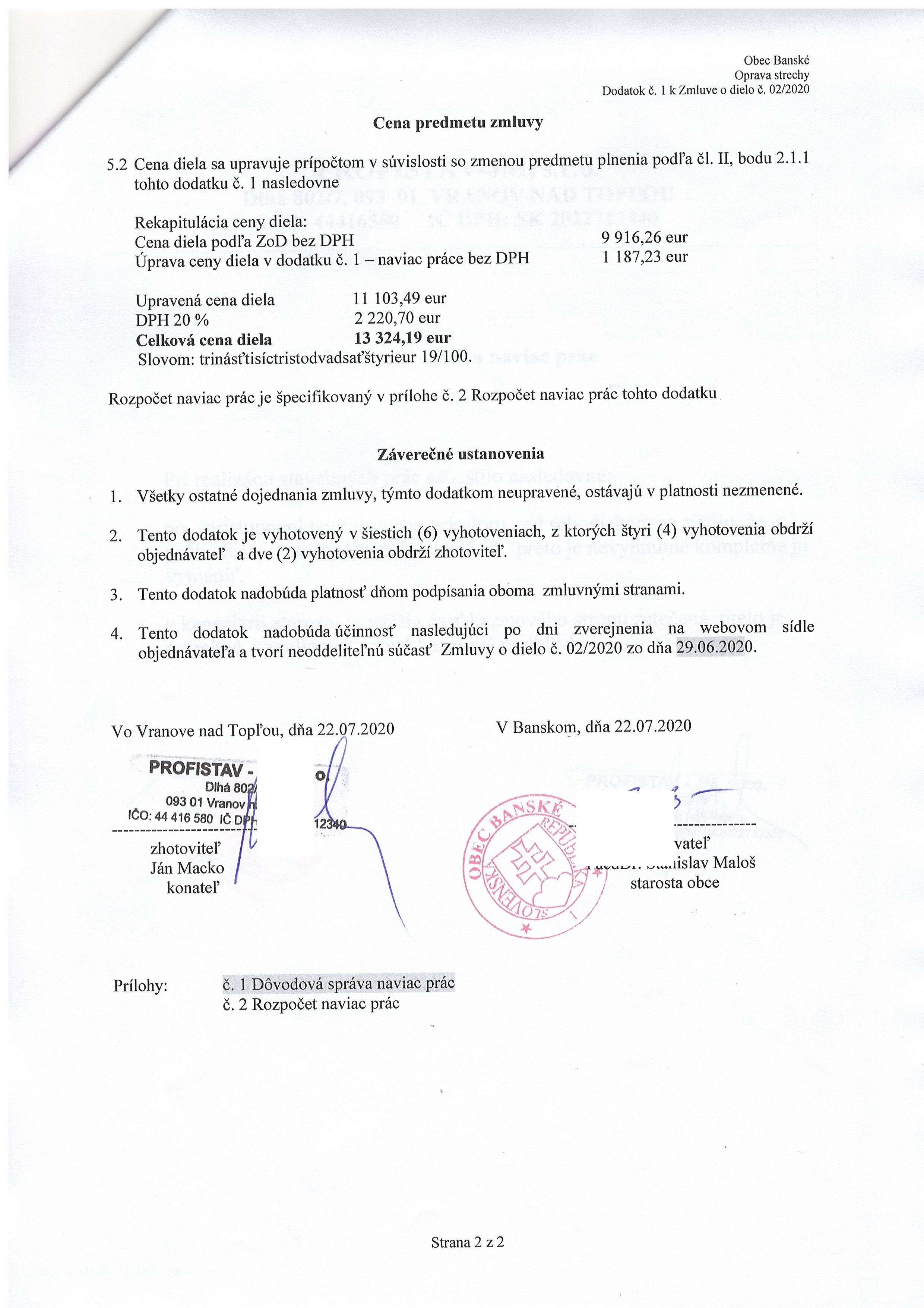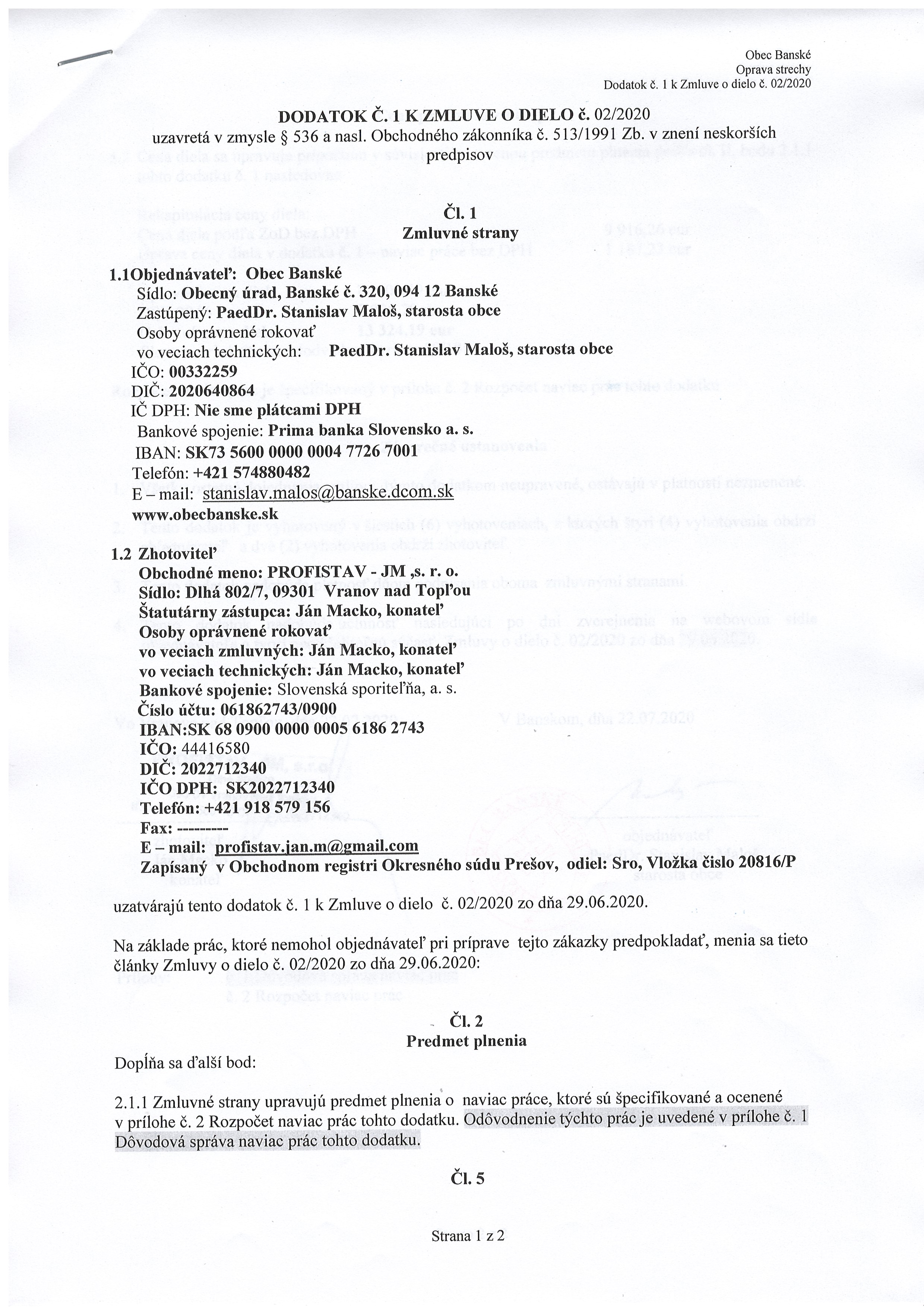- Dodatok č. 1 K zmluve o dielo č. 02/2020